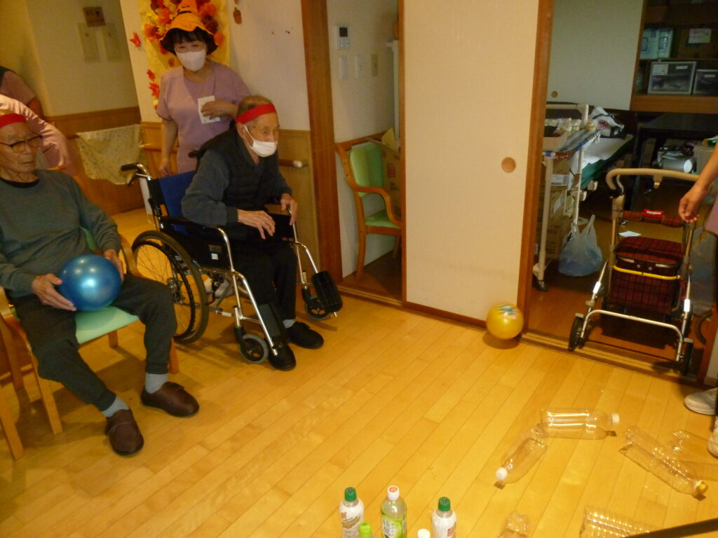 座ったままボールを手に持ち、目の前のボトルめがけて